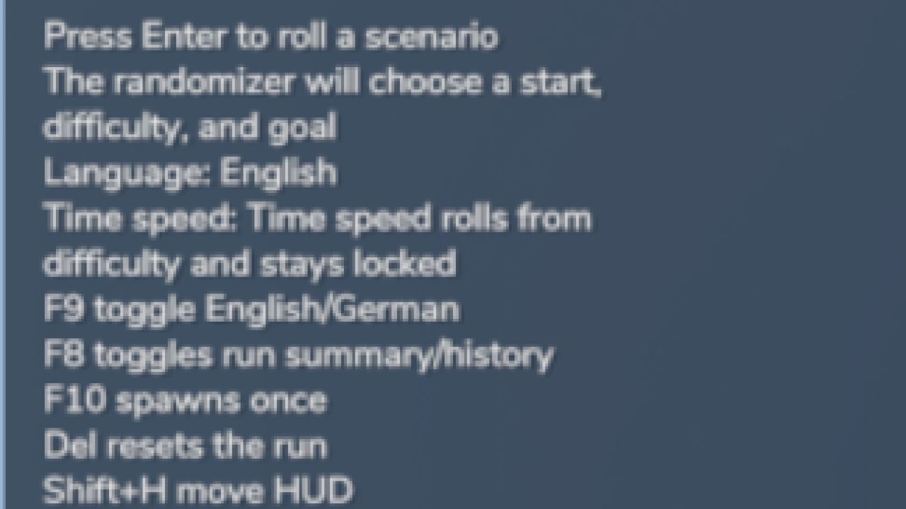 This mod creates a random base-game starter setup with different scenario types, equipment combinations, challenge goals, and difficulty rules. Each run feels different and can be used as a fresh challenge for survival-style playthroughs or series ideas.