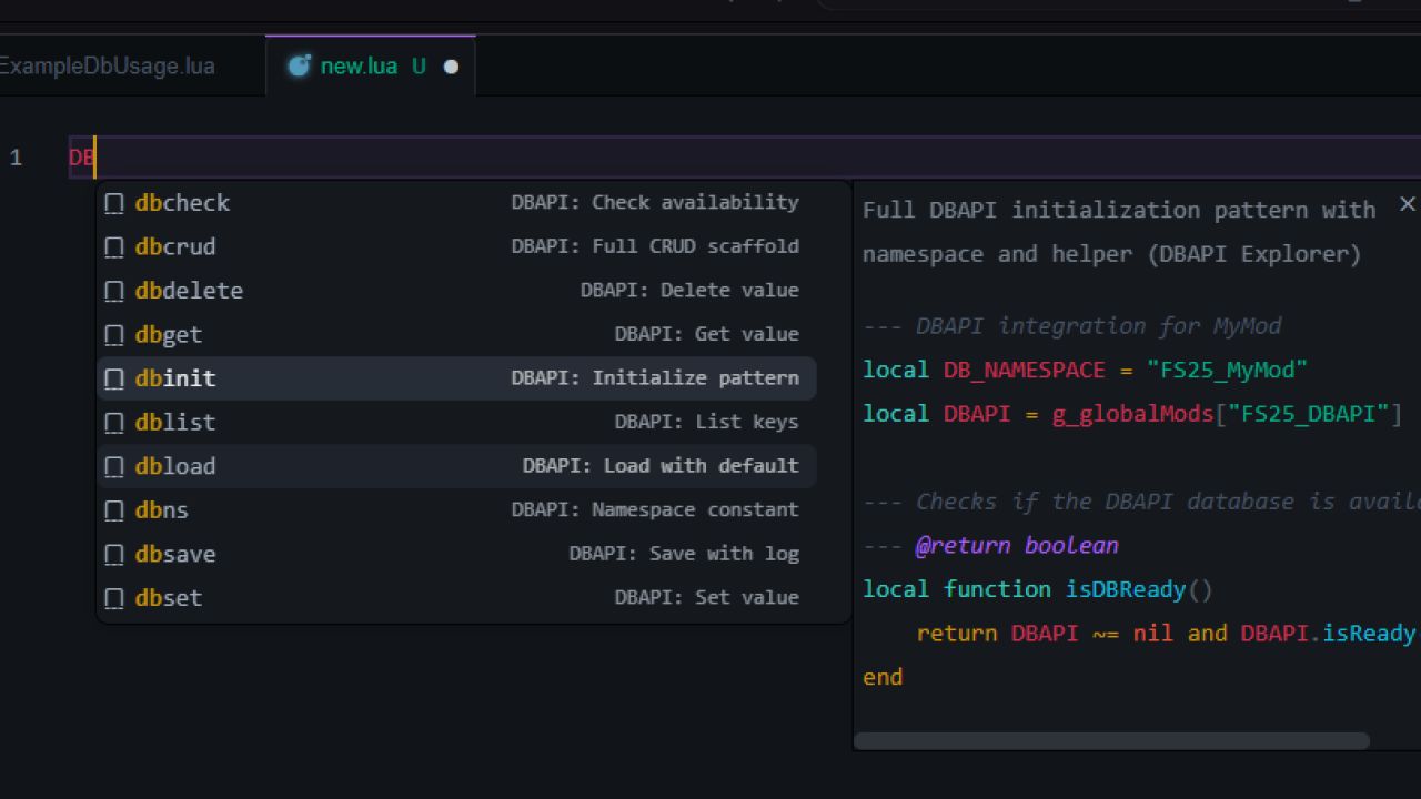 FS25_DBAPI is a streamlined persistence layer for Farming Simulator 25 mods. It replaces fragmented data handling with a centralized, JSON-backed FlatDB and provides a simple global API (g_globalMods[“FS25_DBAPI”].DBAPI) for namespaced key/value storage.