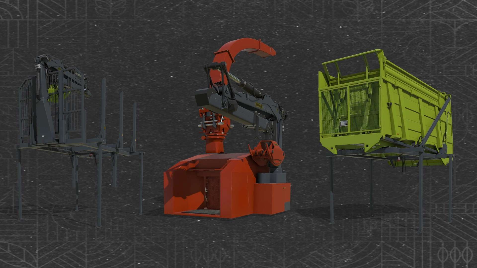 This is a pack of tools for Claas Xerion and Xerion Saddle Trac tractors (mods from Giants). Wood chipper works best with included attachments. It allows you to quickly clean up your forest from fallen trees.