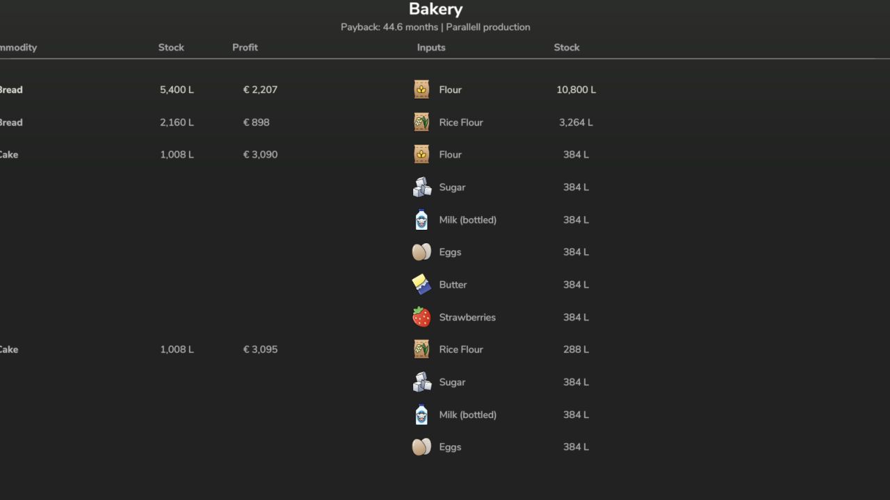 For each production, the mod provides a detailed economic breakdown, including the most profitable product, the best month for production, the maximum possible profit per month, and a direct comparison between processing goods and selling raw materials. This makes it easier to understand where real value is created and how production chains perform throughout the year.