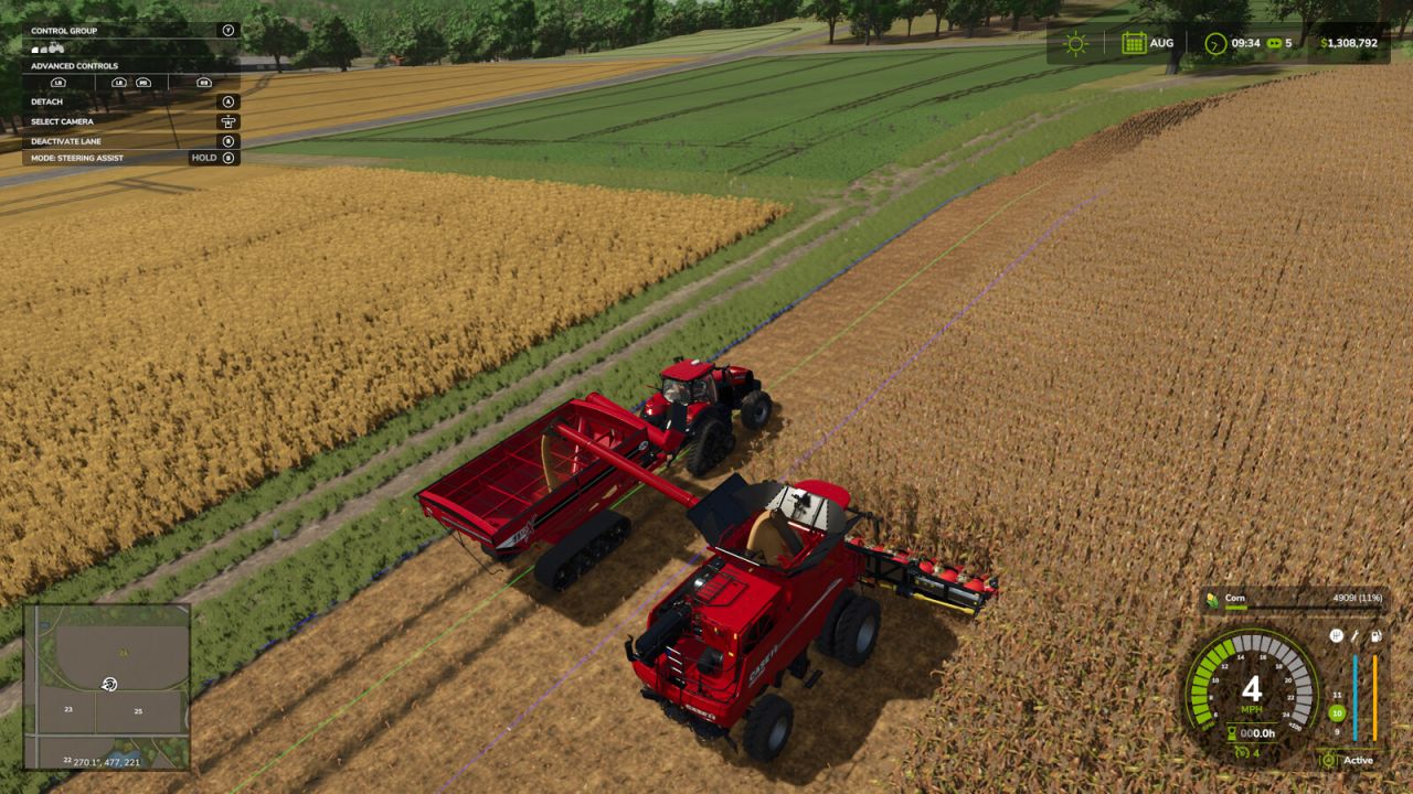 Included is an attachable GPS antenna that allows you to utilize the base-game GPS Steering Assist to line up seamlessly with your combine. Purchase the GPS antenna, pick it up and place it on the tongue with the bracket facing the cart, and then attach as you would a normal implement.You can then set up the steering assist as you would normally, and then match the width and direction settings of your combine. You can then adjust the offset so that your cart lines up below the combine offload.