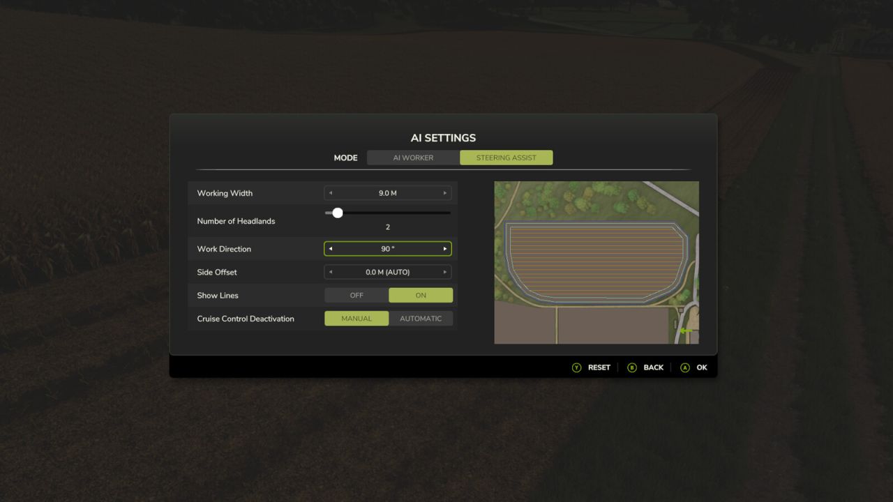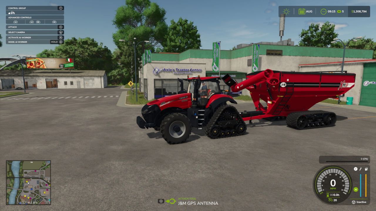 Included is an attachable GPS antenna that allows you to utilize the base-game GPS Steering Assist to line up seamlessly with your combine. Purchase the GPS antenna, pick it up and place it on the tongue with the bracket facing the cart, and then attach as you would a normal implement.You can then set up the steering assist as you would normally, and then match the width and direction settings of your combine. You can then adjust the offset so that your cart lines up below the combine offload.