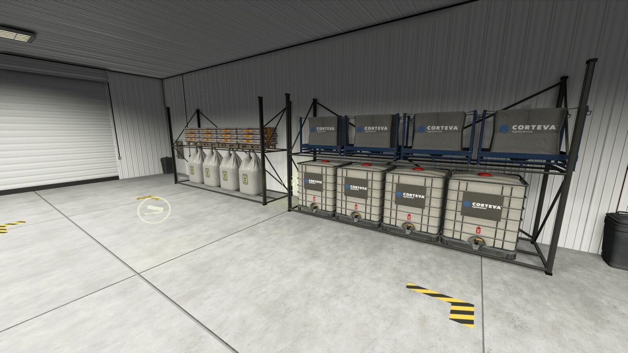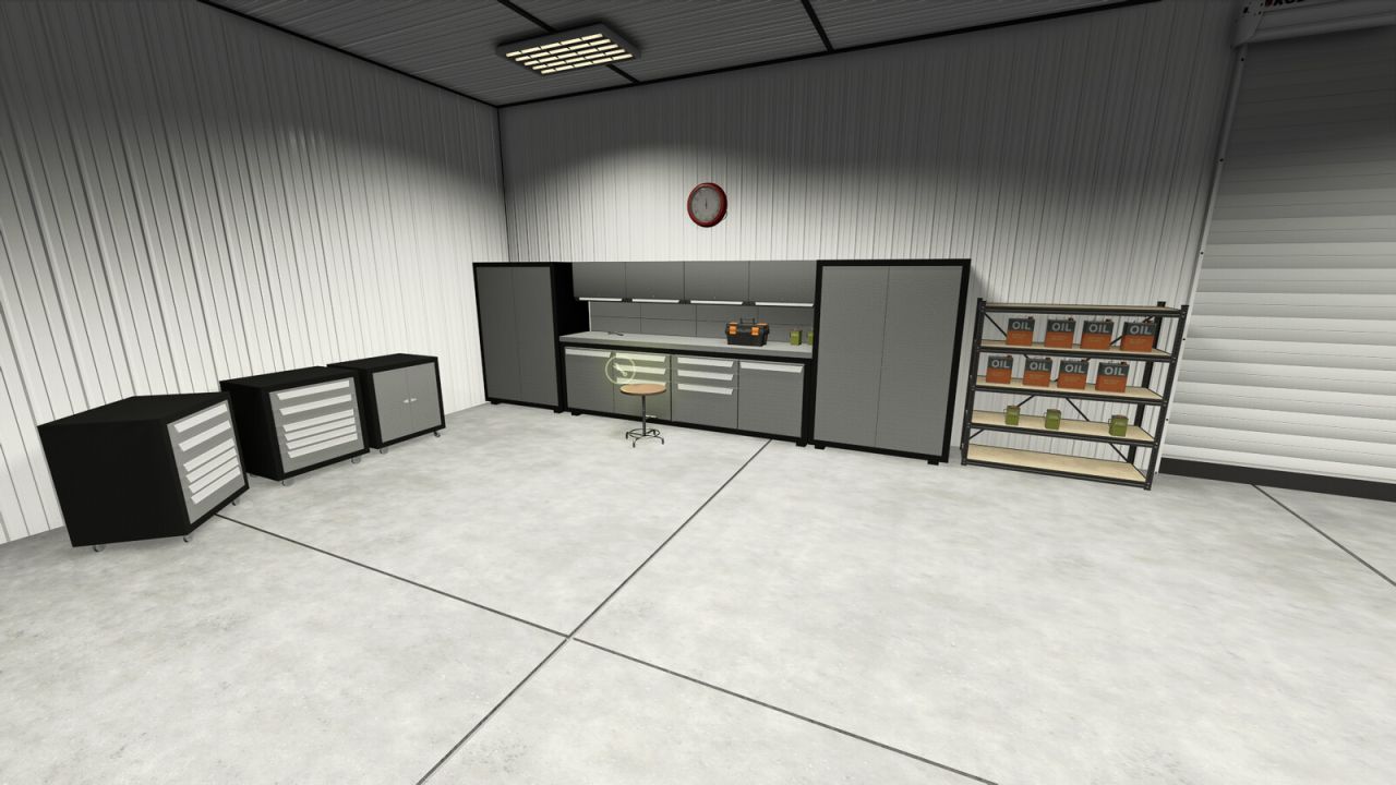 In work area You can storage crops, machines, pallets and Big Bags on shelves with AutoLoad and repair/repaint/customize or sell vehicles.