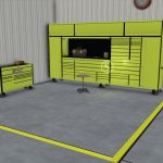 In work area You can storage crops, machines, pallets and Big Bags on shelves with AutoLoad and repair/repaint/customize or sell vehicles.