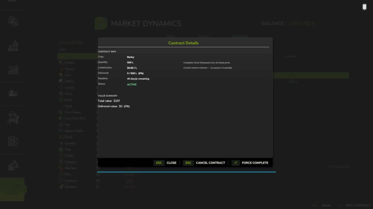 Futures contracts — lock in a sell price today for delivery up to 120 in-game days from now. Fulfill on time for the full locked-price payout; miss the deadline and you take a 15% penalty on the unfulfilled portion. If you have FS25_UsedPlus installed, your credit score scales that penalty between 10% and 20%.
