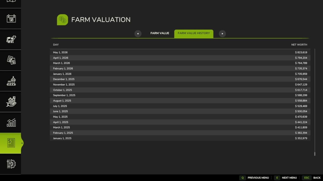 Adds menu screen with a tab to sumarize your farms total value in a balance sheet and a history tab to summaries the history of your farms value.