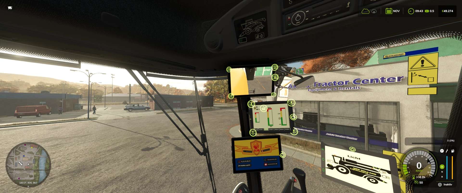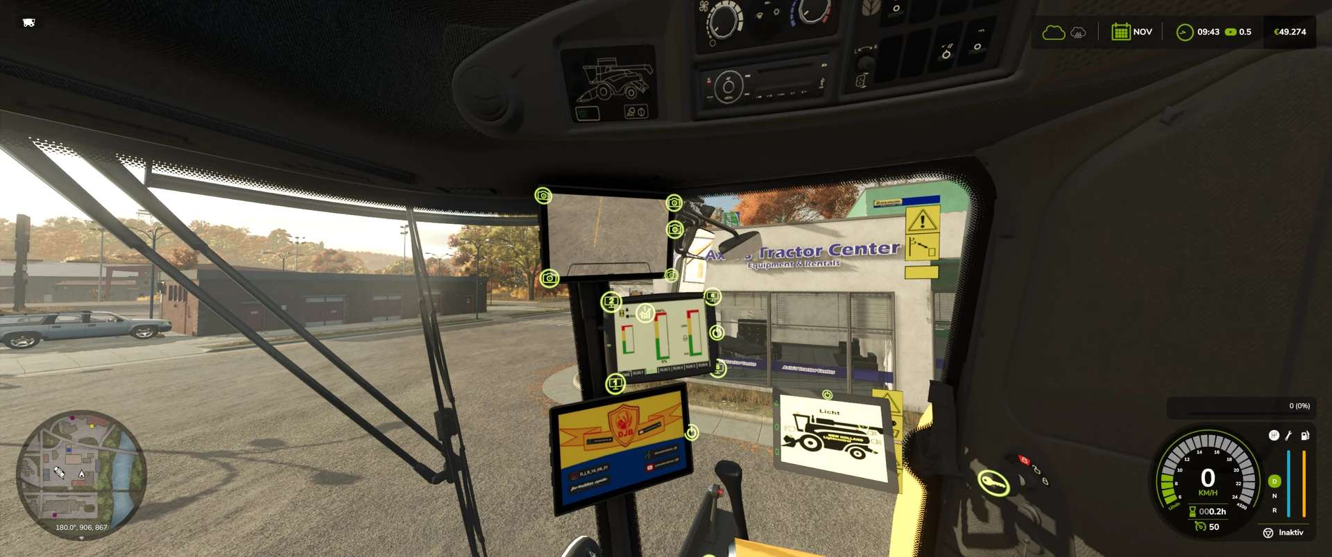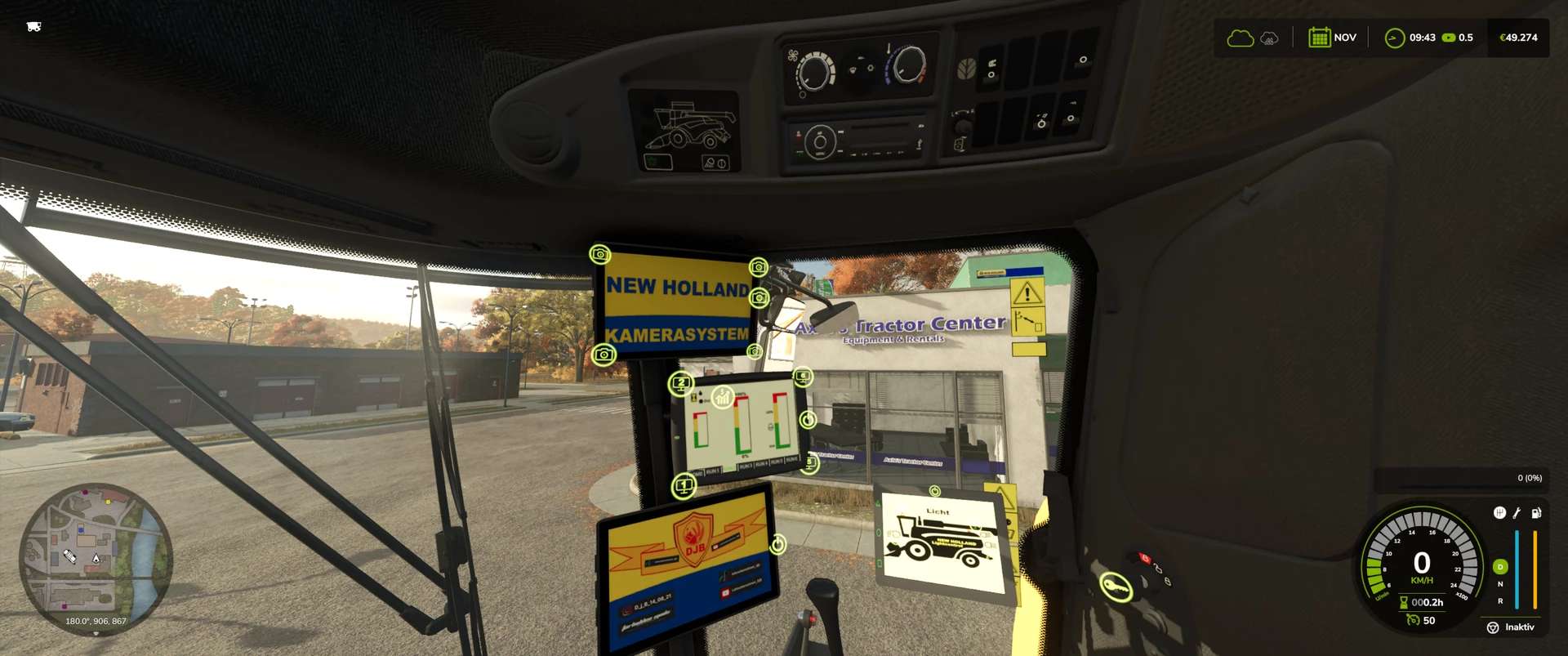 Interior IC: Fold the ladder in/out, turn all monitors on/off, switch between 4 displays on the main monitor (which also have ICs), turn the beacon on/off, lights Front/rear auger on/off, windshield wipers wipe once, grain tank open/close, engine start/stop, threshing drum (cutter) on/off, auger fold/unfold.