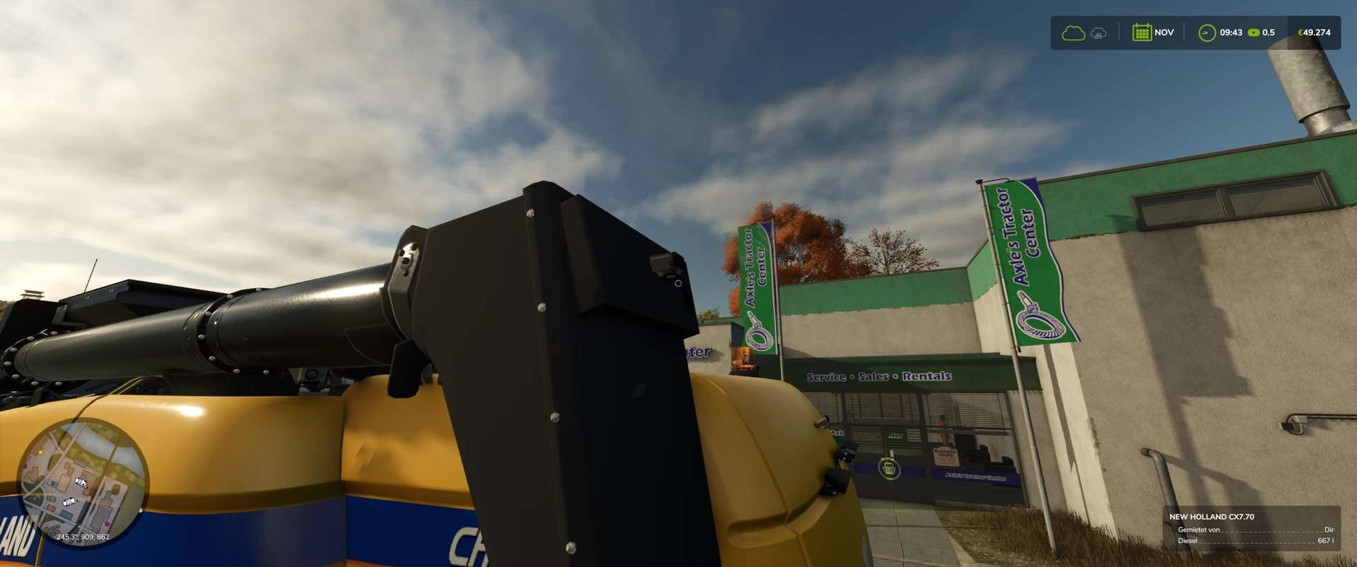 Configurable in the shop: New Holland logos, warning LEDs, additional LEDs on the sides, anti-Claas, John Deere, and Case decals, DjB decals (offer a discount), advertising on the roof (Häckterjäger, DjB [discount], Forbidden mod [discount]) or New Holland, tires, straw chopping width [between 9.15m and 12m], warning signs, auger length [small, medium, large], passenger, rotating beacon, tiger decal, door stickers, cooler, warning LEDs on the warning sign, and grain tank size.