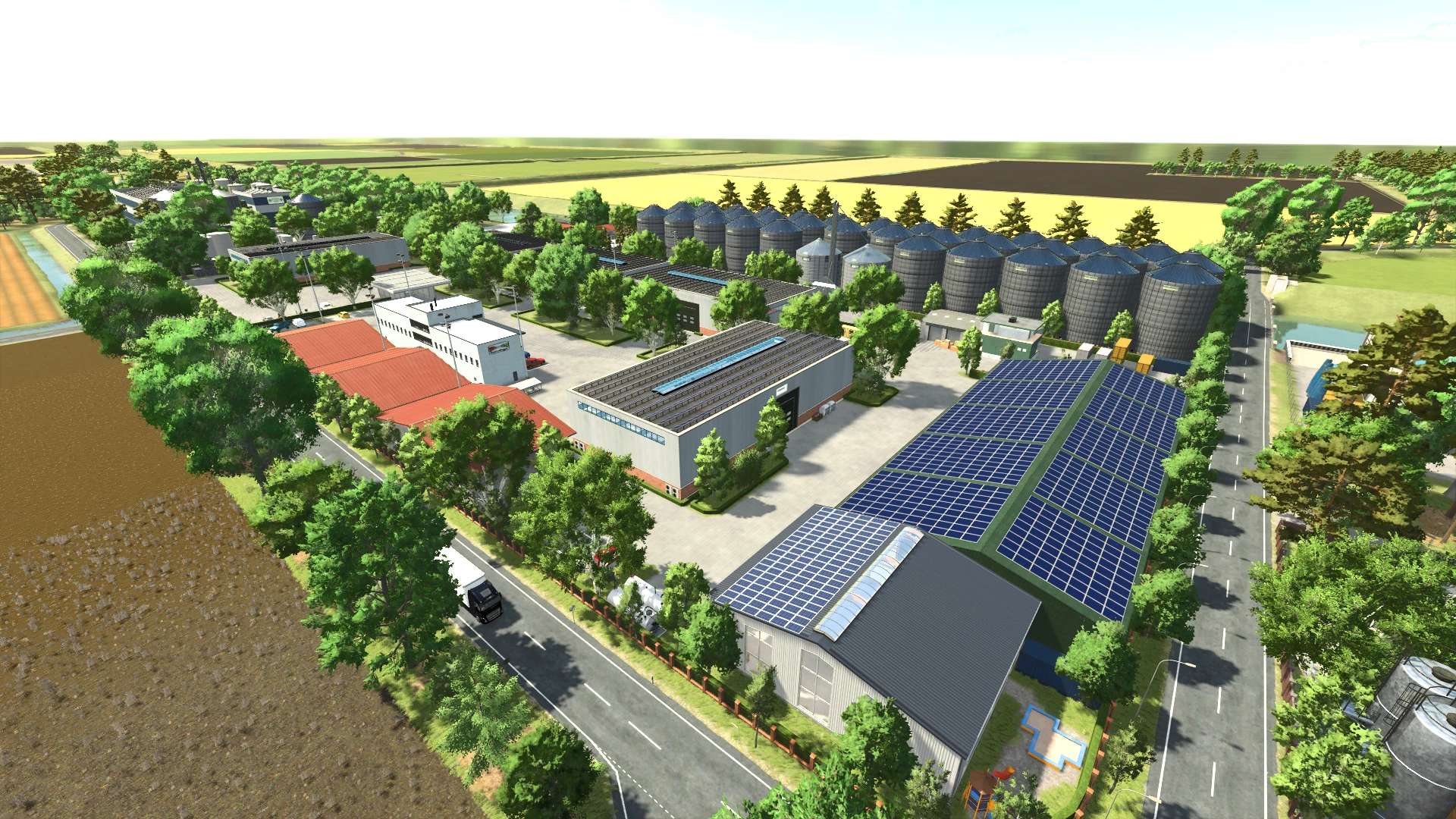 Central warehouse built, including: FED liquid storage 9,800,000L, FED grain silo 71,000,000L, 2x FED root crop storage, 2x FED bale storage, 1x FED wool & cotton storage, 2x 500,000L manure storage, 1x machine workshop, 1x large machine hall, 2x bulk material halls