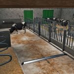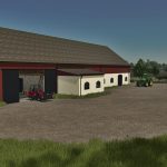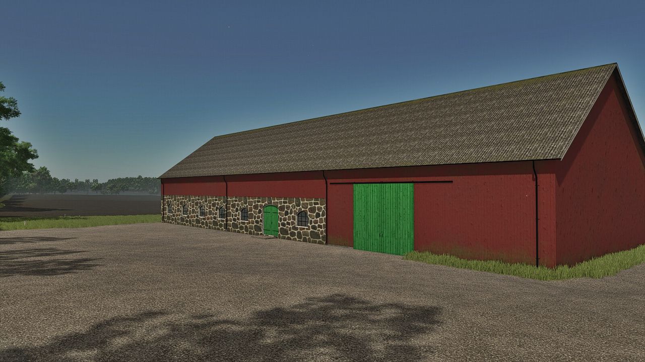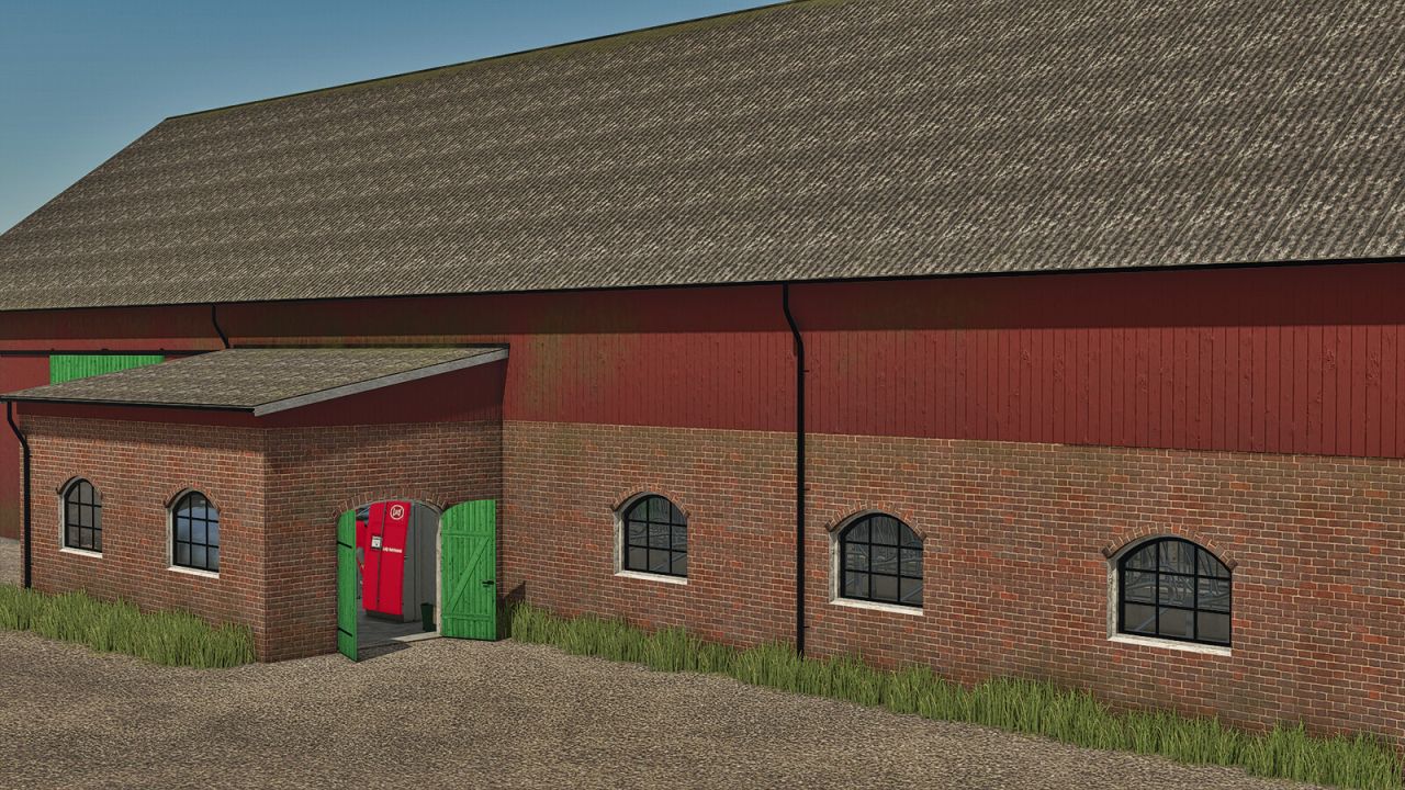 There are two versions of the building: one with a pasture and one without. In addition, there are many configurations, such as three different types of exterior walls: stone, brick, and plaster. Green or black doors and color selection for the upper walls. It’s also possible to choose the brand of the milking robot.