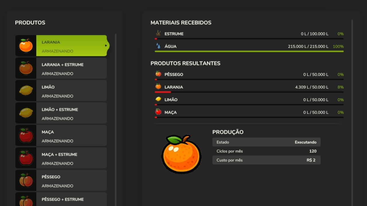 Grow fruit through Fruit Trees or a Fruit Orchard, producing apples, oranges, lemons, and peaches. To maximize performance, you can also use manure, increasing production productivity.