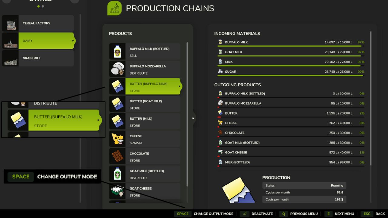 The output button in the production menu now cycles through: Store (no pallets), Spawn, Sell, and Distribute.