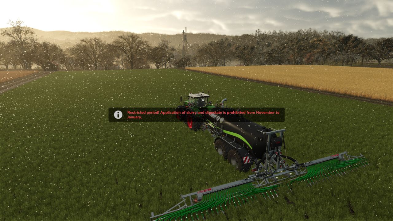 If the player attempts to turn on a slurry tanker or manure spreader during a restricted period, the action is blocked, and a warning message (e.g., “Restricted Period!” or “Ground Frost!”) appears on the screen.