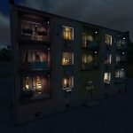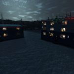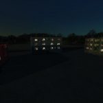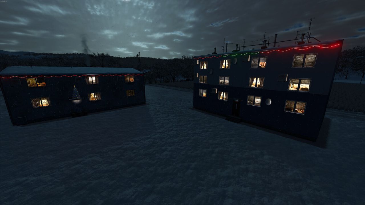 Two decorative State Farm-style apartment blocks with lighting, smoke emitter and Christmas decorations.