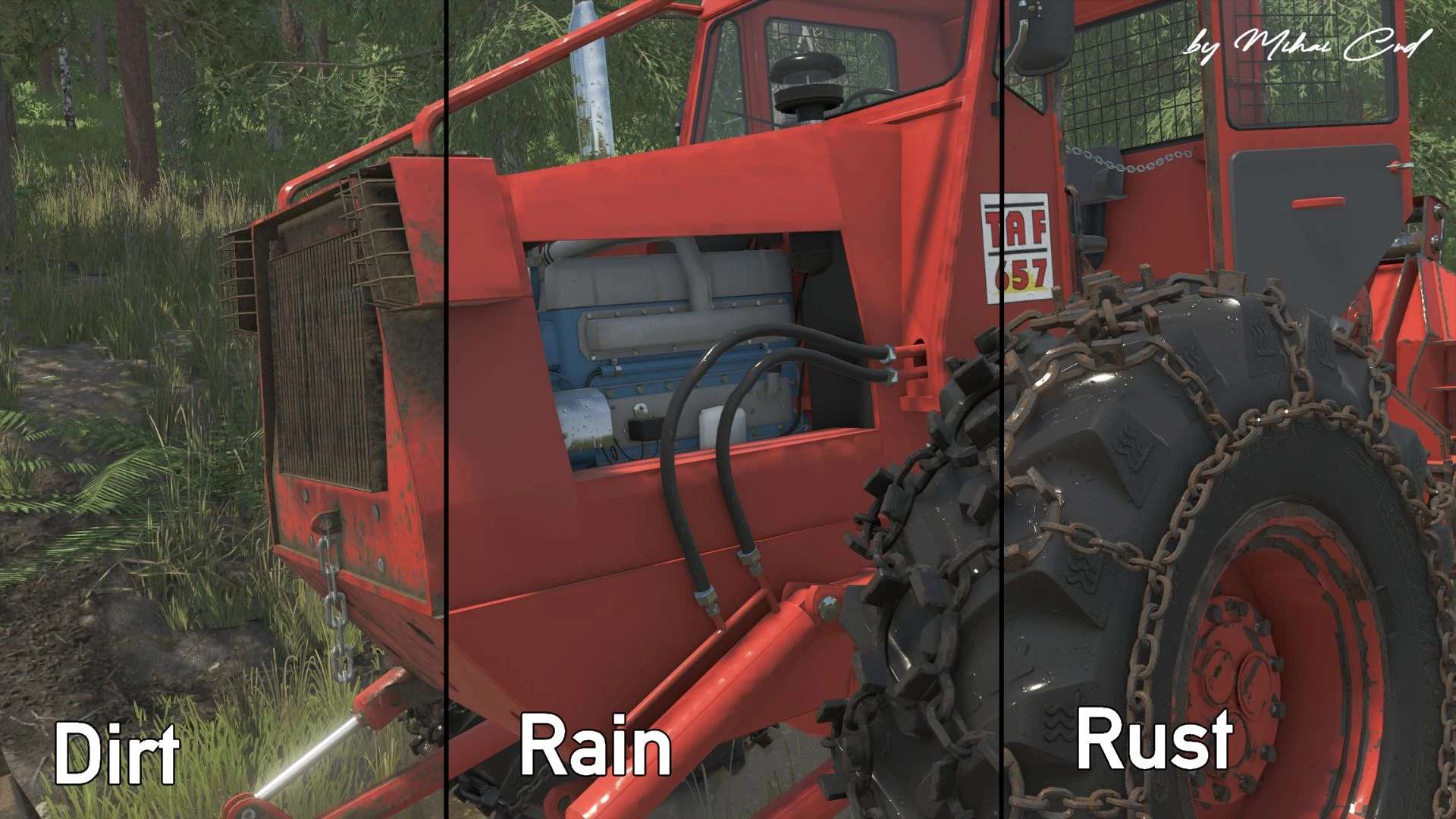 TAF 657 – IRUM SA is a heavy-duty articulated forestry tractor. The mod is converted from Farming Simulator 22 and features a reworked 3D model.