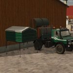 A crane can be purchased for $22,100 in the store category “Miscellaneous”, it can only be attached to the long Unimog U1X50. The crane has a hook with which big bags can be loaded. When the crane is attached, the Unimog can then also pick up the short body trough.