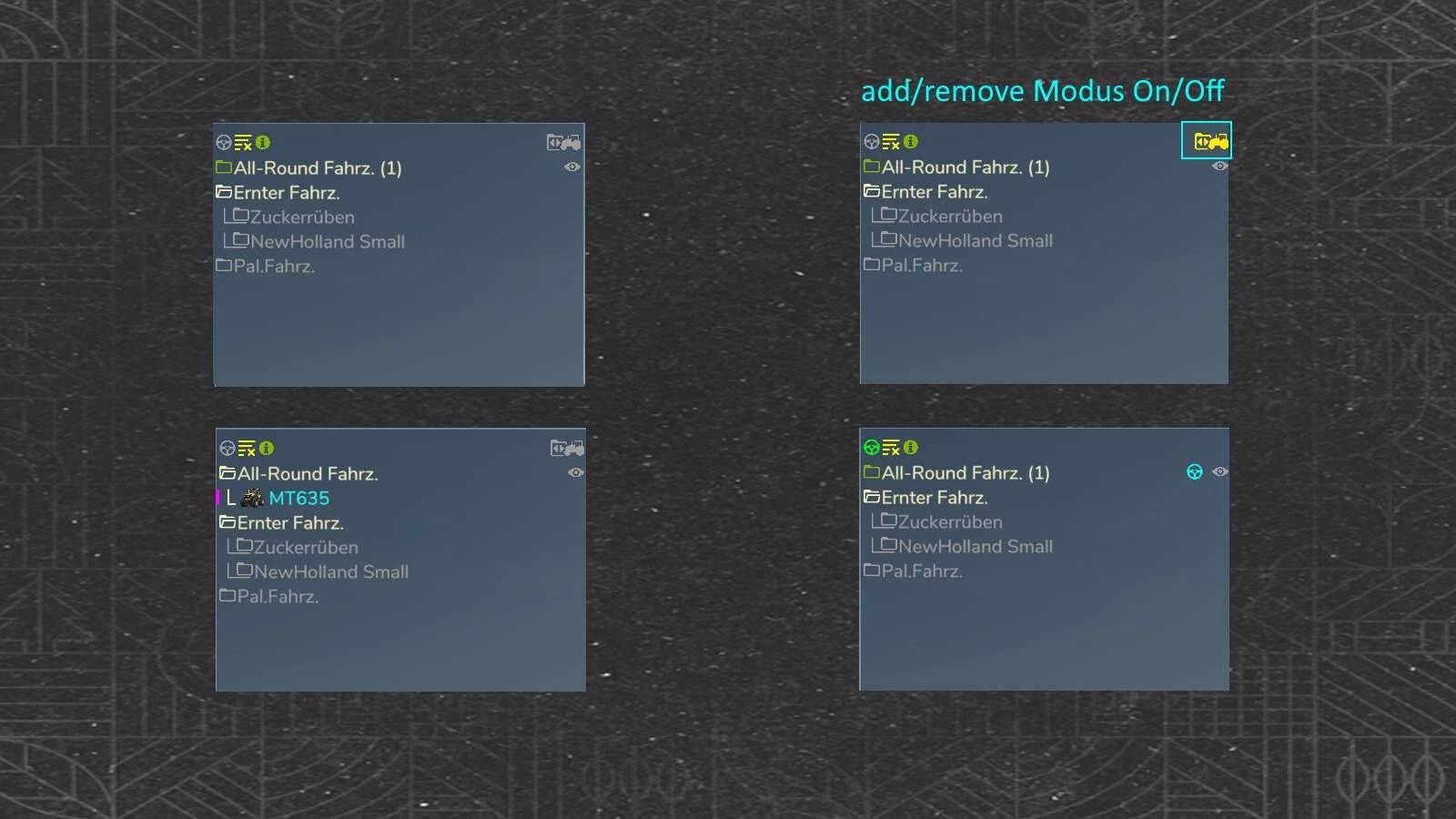 Create personal vehicle groups and manage them via a display box. You can customize the display box and optionally align it.